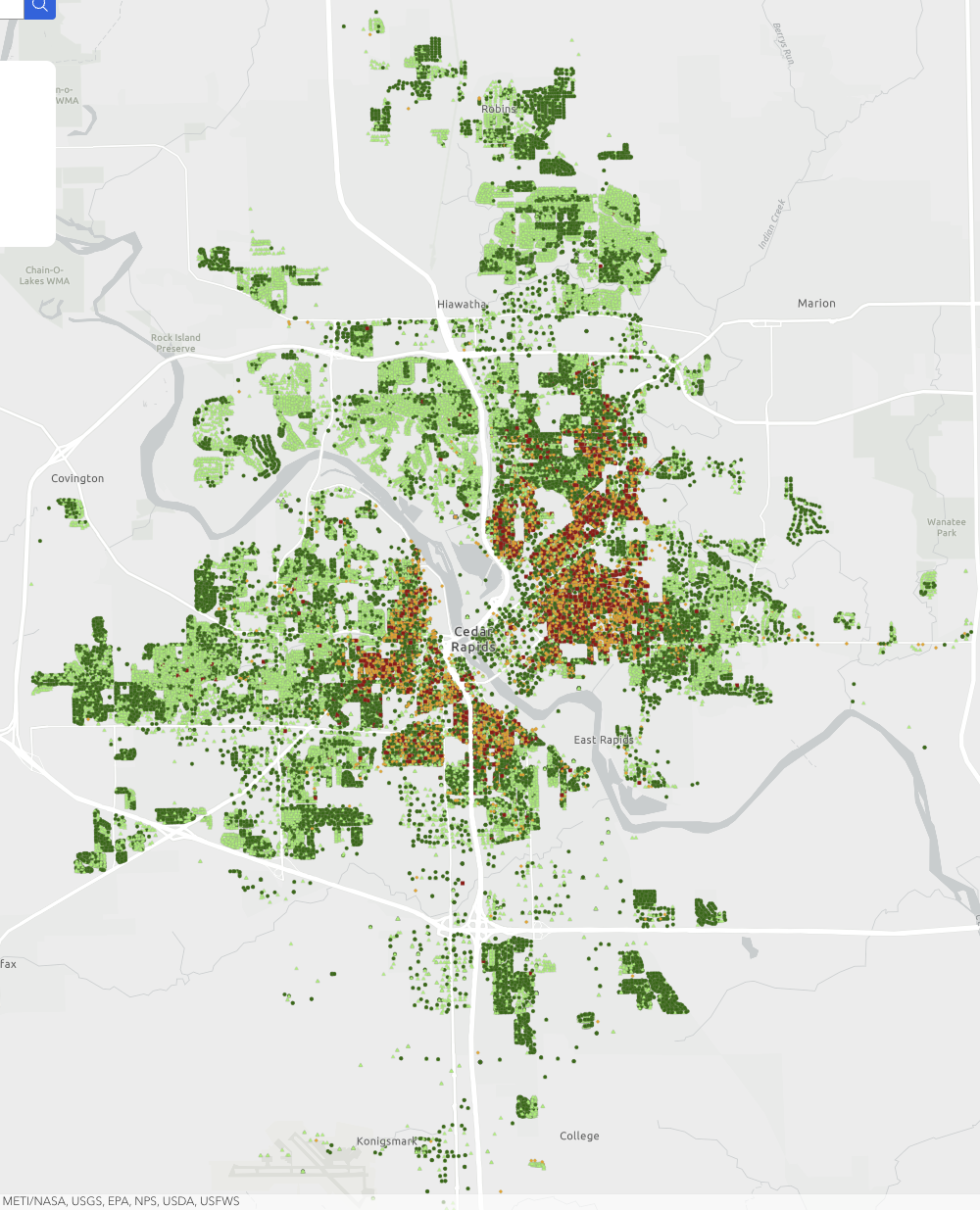 The older core of Cedar Rapids — downtown and surrounding neighborhoods — is heavily speckled with red and orange: